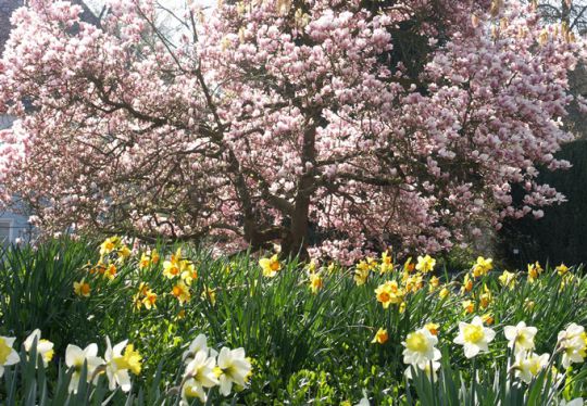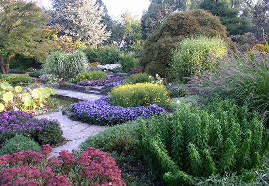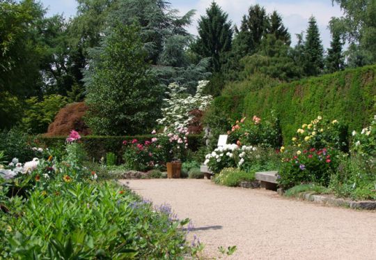 Sortimente von Strauchrosen, Pfingstrosen, Rittersporne bilden ideale Pflanzenkombinationen. Staudenphlox, Sonnenbraut, Akelei, Nelkenwurz, Gemswurz und Polsterstauden wie Blaukissen, Polsterphlox, Schleifenblume, Steinkraut sind ergänzende Komponenten. Zwiebelgewächse wie Kaiserkronen Tulpen, Schneeglanz bilden den Frühlingsakzent, Kleingehölze sowie Elemente des Bauerngartens wie Tränendes Herz, Stockrose und Brennende Liebe füllen die Rabatten.