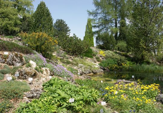 An der Nordseite des Alpinums sorgen ein Bachlauf und zwei Teiche für Verdunstung und ein für Alpenpflanzen geeignetes Mikroklima.