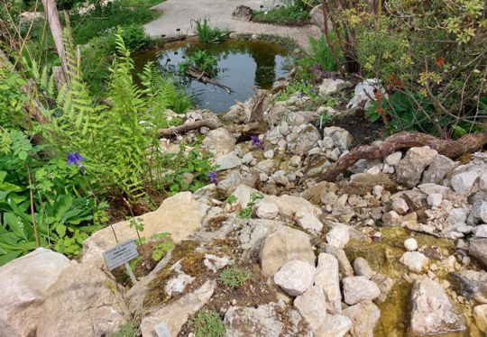 Während in den Bergen Tau und Nebel die Luft befeuchten und vielen Pflanzen als Wasserspender genügen, sorgen im Linzer Alpinum zwei Teiche und ein Bachlauf für Verdunstung und ein geeignetes Mikroklima.