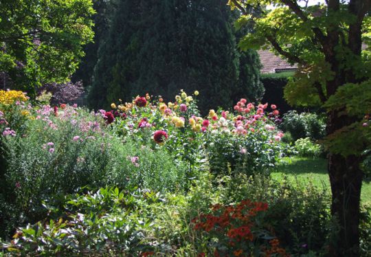Bunte Blütenvielfalt der Dahlien in den Staudenbeeten beim Hufeisenteich