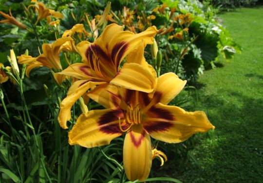 Klassische Sommerblumen sind die Taglilien (Hemerocallis), die besonders in den Teichbeeten nahe der Gartenbühne konzentriert sind. Nomen est Omen: die wunderschönen Blüten sind wirklich nur einen Tag geöffnet. Jede Pflanze bildet aber relativ viele Einzelblüten aus, sodass doch mit einer längeren Blütenphase gerechnet werden darf.