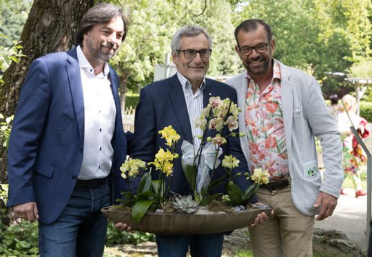 Mag. Franz Koll von Bellaflora überreichte Dr. Friedrich Schwarz ein Orchideengesteck.